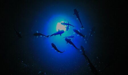 School of fishes swimming on dark sea botton in a cave. Abstract underwater background or backdrop.
