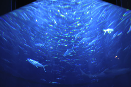 Many fishes on blue water with silhouette of people taking photos