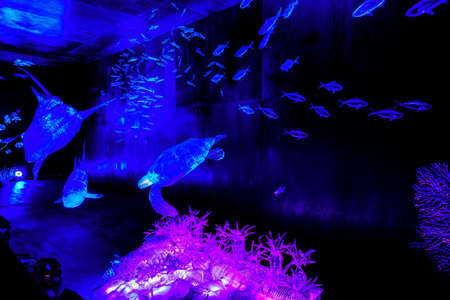 Selective focus of fishes with neon light on dark background