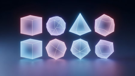 A collection of transparent geometric solids like cubes, pyramids, and polyhedra, illuminated with vibrant neon colors and casting reflections.