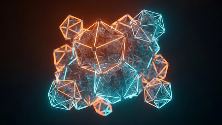 A 3D geometric octahedron structure with glowing neon pink and blue edges, set against a dark background with floating particles and internal reflections.