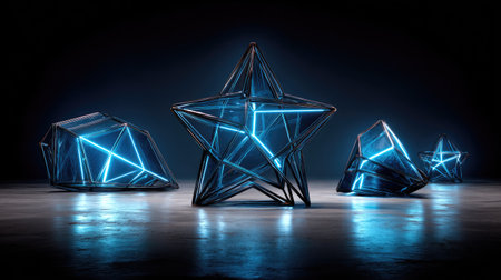 A central star-shaped structure and several geometric shapes are depicted, outlined with bright blue neon light. The artwork is rendered with a dark background and a reflective surface, emphasizing the light and shapes. This design would be suited for various commercial applications, including graphic design and digital media projects.