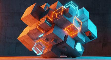 presents a complex and intricate abstract sculpture composed of numerous concrete cubes. Interspersed within and around the solid forms are glowing geometric outlines in neon orange and cyan. The textured concrete surfaces and the dramatic lighting create a futuristic and technologically advanced aesthetic. The arrangement suggests a sense of interconnectedness and a possibly digital, structure.