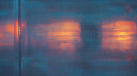 This image showcases a detailed close-up of a metallic grid bathed in warm light, featuring beautiful reflections and a soft focus.