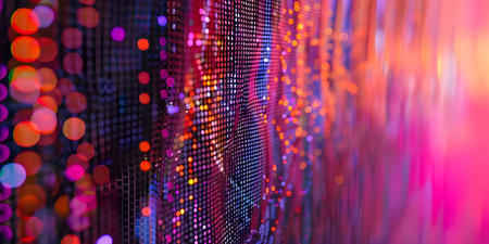 Abstract texture of metal mesh wall with vibrant colored light patterns for modern design