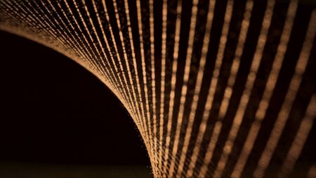 Close up of an object surrounded by mesh black material against bright light. Unusual black grid texture moving against bright lamp.