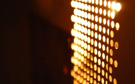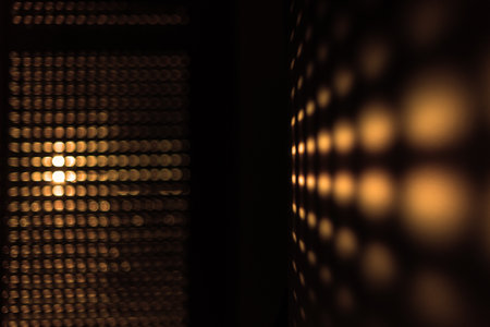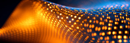 A detailed close-up view of a metallic surface with small, bright lights shining on it, creating a visually striking and industrial aesthetic. The lights reflect off the metal, highlighting its texture and creating an interesting pattern of shadows.