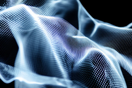 vibrant network of luminous particles forms a digital lattice dark surface casting an intriguing glow that highlights the intricate design and depth of the scene.