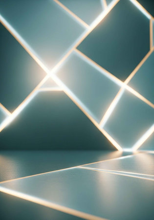An abstract background featuring a metallic texture with a fine grid pattern. Bright, sharp streaks of white and golden light cut across the surface, creating a sense of depth and technological sophistication. The lighting is dynamic and highlights the textured surface.