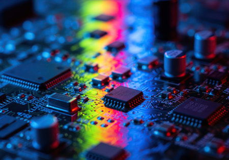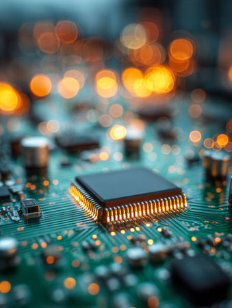 A detailed view of electronic components on a circuit board, illuminated by vibrant bokeh lights that evoke innovation and technological brilliance.