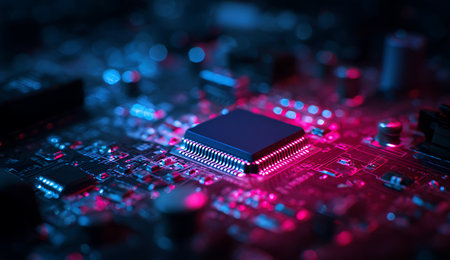 A detailed view highlighting a central microprocessor on a circuit board illuminated by striking pink and blue neon hues, evoking futuristic innovatio
