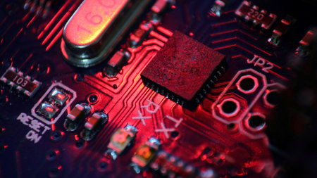 Bokeh electronic circuit close up computer in red colors