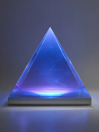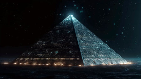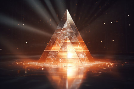 A clear pyramid is lit up by a bright light. The light is shining on the pyramid, creating a beautiful and mesmerizing effect. Concept of wonder and awe, as the pyramid appears to be a magical