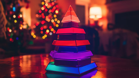 A vibrant, colorful stacked pyramid decoration glows warmly against a cozy holiday backdrop, adding a festive touch to any seasonal scene.