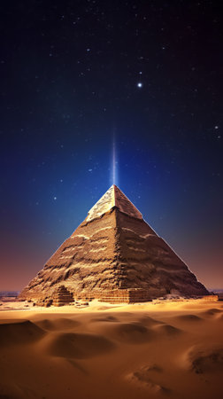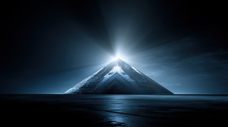 Discover a stunning pyramid structure illuminated by radiant light, set against a dark background for innovative and artistic themes. Perfect for inspiration and creativity.