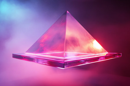 A floating 3D pyramid constructed from transparent neon panels, emitting soft pulses of energy, created by ai