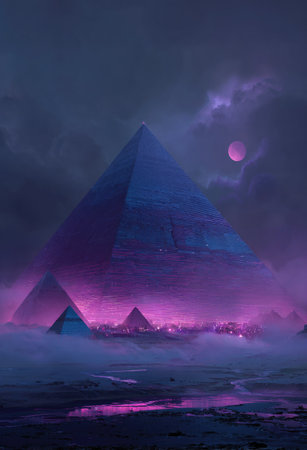 The image showcases ancient pyramids bathed in a moonlit, surreal environment. The composition features a gradient of blues and purples, creating a mysterious and otherworldly ambiance. The pyramids are framed by dense, atmospheric clouds, suggesting a nighttime setting. This artwork could be used for various commercial projects and editorial purposes.