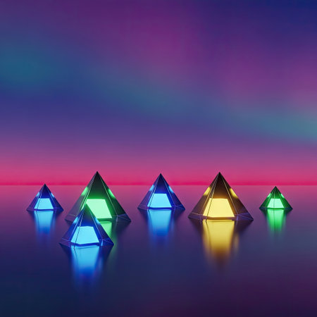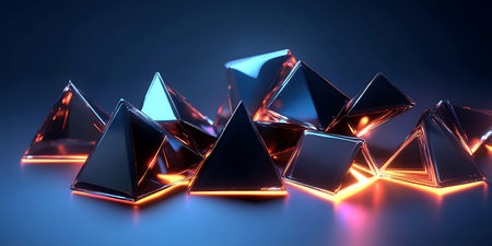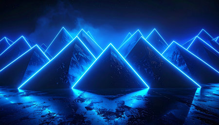 This abstract artwork features several geometric pyramids illuminated by vibrant neon colors. The pyramids are placed on a reflective surface, enhancing their visual impact, with a gradient background. The overall composition and color palette suggest potential use in design projects or conceptual illustrations related to technology.