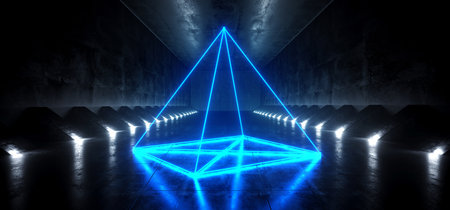 Alien Sci Fi Futuristic Modern Neon Glowing Hologram Pyramid Stage Blue Construction Metal With Studio Lights And Lasers Path Glowing Lights Empty Grunge Concrete Gate Dark 3D Rendering Illustration
