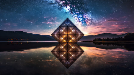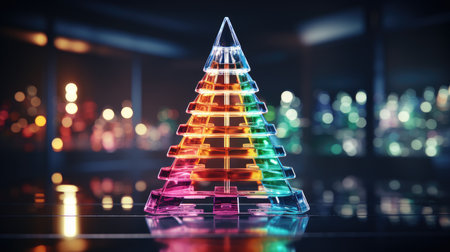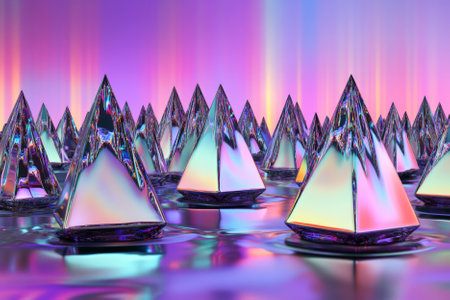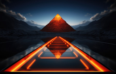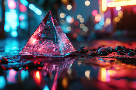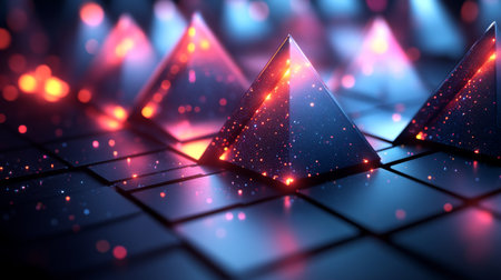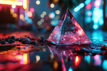 A captivating arrangement of glowing pyramids on a reflective surface with vibrant lights in an abstract composition at night. Generative AI