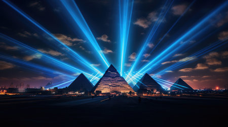 Pyramids of Giza during a stunning light and sound show, with vibrant colors and patterns illuminating the ancient structures against the night sky.