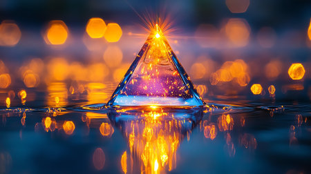 A levitating crystalline pyramid refracting light in an abstract shape. A high quality image making by generative ai.