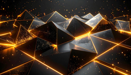 Abstract geometric landscape with dark polygonal shapes illuminated by glowing orange lines and golden particles.