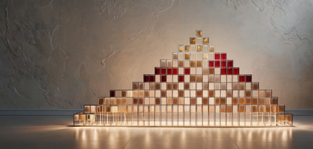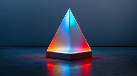 An illuminated pyramid form is presented against a dark backdrop. The structure showcases a range of colors. The style is modern, with smooth surfaces and balanced composition. The lighting highlights the shape's features. This image is suitable for promotional materials or editorial content.