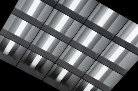 Bottom view of a fluorescent lamp on the suspended ceiling.