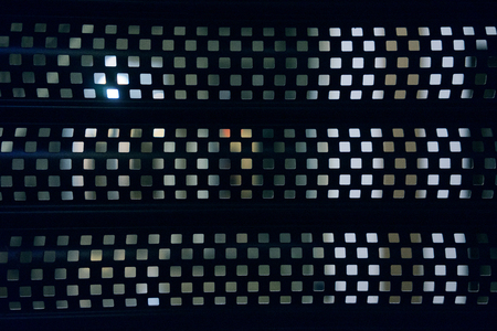 Abstract dark background with a bokeh group of round monochrome holes and glare mesh structure