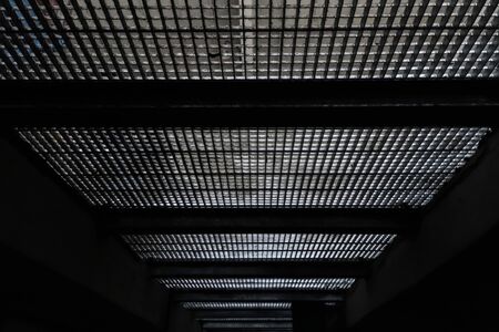 Mesh suspended ceiling with fluorescent or LED square lights in a modern shopping center or office building. Tinted
