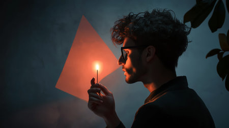 The lit match in hand with a blue flame illuminates the darkness