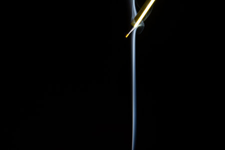 Hand with a match igniting an incense stick in a holder, black background