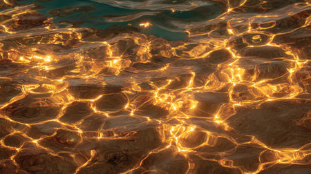 Shimmering surface of water reflects golden hues, creating mesmerizing pattern of light and movement. tranquil waves evoke sense of calm and beauty in nature