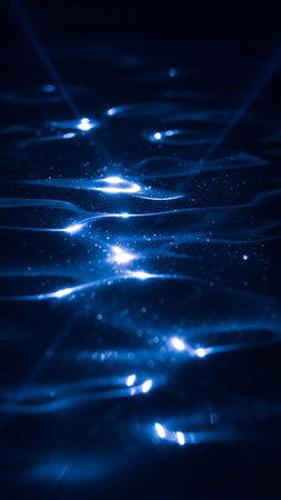 A dark, deep blue water surface at night, illuminated by bright, sparkling light reflections and subtle ripples, creating a dynamic and luminous texture.