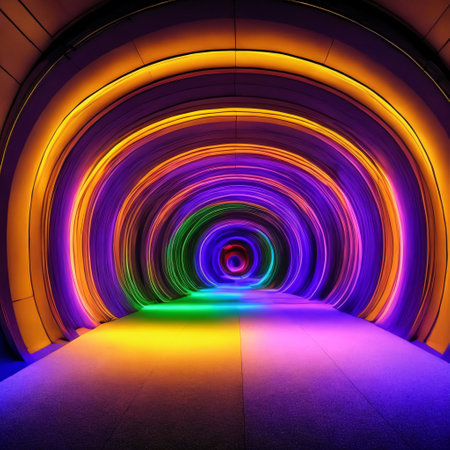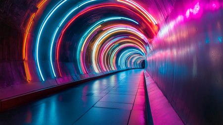 This captivating image showcases a tunnel illuminated by colorful neon lights, creating a dynamic and energetic atmosphere at night. The light trails symbolize motion and speed, reflecting creativity in urban design.