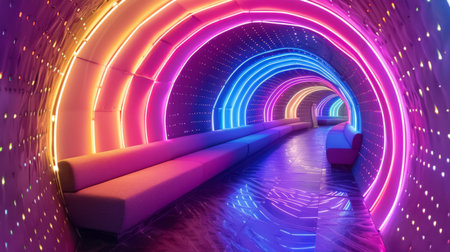 Vibrant neon-lit tunnel with colorful LED lights and modern seating, creating a futuristic atmosphere.