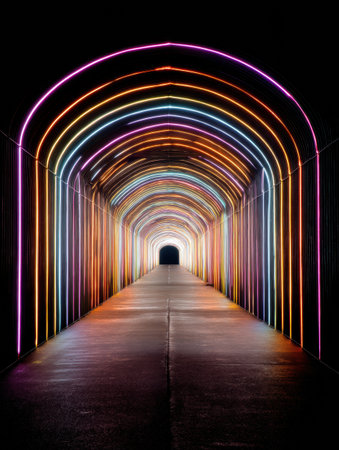 Vibrant neon lights line a dark tunnel, creating an artistic ambiance as the colorful arches lead toward a distant exit, enhancing the mysterious atmosphere.