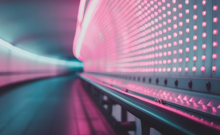 A modern tunnel with glowing neon pink and blue lights, forming an abstract path that seems to stretch into infinity.
