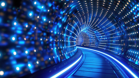 A mesmerizing futuristic tunnel design with glowing blue lights illuminating a curved pathway, perfect for themes of technology and sci-fi.