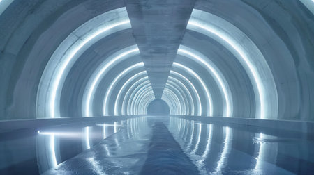 Futuristic underground sewer tunnel with reflective water - concept of urban infrastructure and engineering marvels.