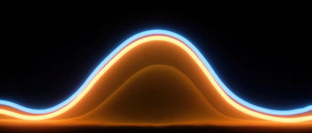This abstract illustration features glowing orange and blue neon light wave patterns against a dark background. The composition highlights smooth curves and contrasts between light and dark elements. It could be suitable for various commercial uses, including digital art, graphic design, and website backgrounds.