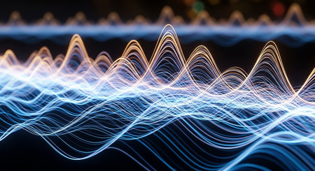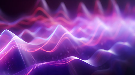 An abstract visualization features a vibrant, undulating waveform rendered with glowing lines against a dark backdrop. The composition showcases dynamic lines in shades of purple and red. This conceptual image may be suitable for illustrating themes related to sound, data, and technology in various digital contexts.