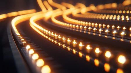 An image captures a dark road illuminated by a series of glowing lights, creating a winding path. The golden hue of the lights contrasts with the dark asphalt and the dusky sky. The composition suggests motion and direction, possibly suitable for promotional materials or editorial content.