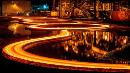 This stunning industrial landscape features a glowing liquid stream winding through a factory setting, creating a warm, vibrant atmosphere.