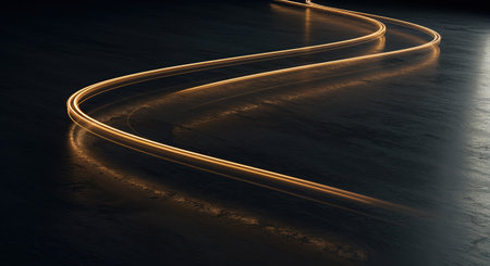 An abstract golden light path winds over a polished dark background, casting bright reflections and highlighting the subtle surface texture with a futuristic, clean aesthetic.