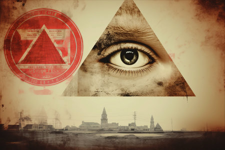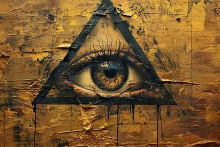 Artistic rendering of the all-seeing eye within a triangle, set against a textured golden background