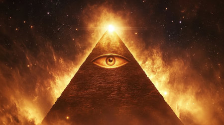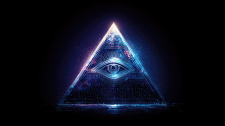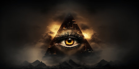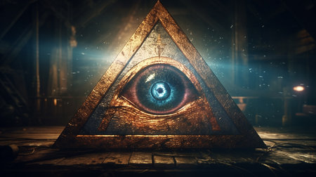 Eye of providence, all seeing eye, mason pyramid with gold details, concept of masonic secret societies. Unveiling the mysteries of the Mystic Illuminati Eye.