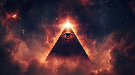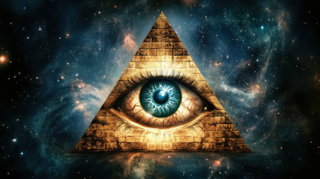 Mysterious Eye of Providence on a pyramid against a backdrop of cosmic space, swirling stars, and abstract nebula patterns.