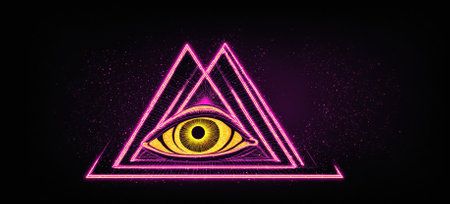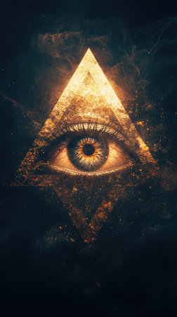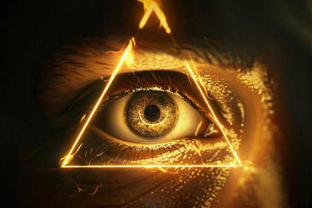 Golden eye with a glowing triangle superimposed, symbolizing the eye of providence, a masonic emblem representing divine watchfulness and spiritual enlightenment